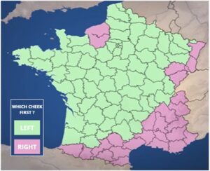 Nowadays, it can be complicated to understand the way the French do the bise, even for the French themselves. In reality, this greeting is very different from one region to another, it can vary from one kiss in the West, up to four kisses in some northern regions, while the majority of France does only two. And there is another concern: which side do we start with? This one is simpler, in the South-East of France, you start from the right and in the North from the left.